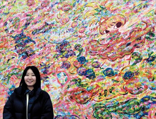 일본 작가 롯카쿠 아야코가 신작 회화 ‘무제’를 배경으로 서 있다. 작가의 자아를 반영하는 눈이 큰 소녀가 캔버스 오른쪽 위에 숨어 있다. /허윤희 기자 |