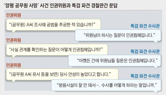 민중기 특검팀에 소환돼 조사를 받고 스스로 목숨을 끊은 경기 양평군청 공무원 A씨를 조사했던 특검 파견 경찰관들이 국가인권위원회의 관련 조사에 출석해 “인권위원들 질문이 인권 침해”라고 반박한 것으로 8일 알려졌다. 인권위는 A씨 사망 경위 등을 규명하기 위해 직권 조사에 착수해 지난 1일 A씨 조사를 담당한 특검 파견 경찰관 4명 중 1명은 직권 남용 혐의로 검찰에 고발하고, 나머지 3명은 검찰에 수사를 의뢰하기로 결정했다. 그런데 이날 인권위의 조사에 출석한 일부 특검 수사관들이 “이렇게 하면 수사를 어떻게 하느냐”며 반발했다는 것이다.