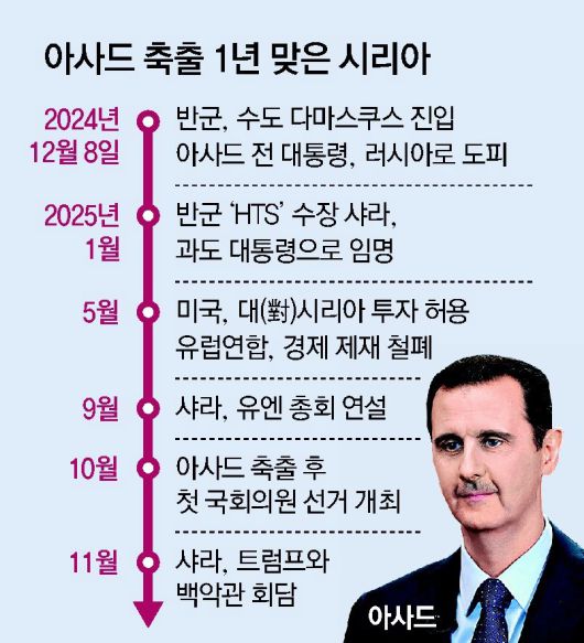시리아가 8일 53년간 대를 이어 철권 통치한 바샤르 알 아사드 정권의 붕괴 1주년을 맞았다. 이날 카타르 알자지라방송과 독일 공영방송 도이체벨레(DW) 등은 반세기 넘는 독재와 14년간 이어진 내전, 나아가 극단주의 무장세력 이슬람국가(IS)의 창궐까지 겪은 시리아가 국가 정상화를 향한 험난한 과도기를 겪고 있다고 평가했다.
