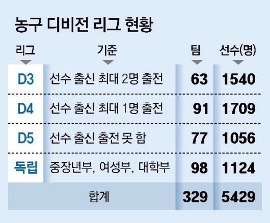선출이 아닌 동호인들도 디비전 리그에 참가하려면 선수 등록 절차를 먼저 밟아야 한다. 디비전 시스템의 기틀을 다지는 데 힘을 보탠 김수빈 서울시농구협회 부회장은 “시작은 모든 동네 농구인까지 다 선수로 등록해 관리하자는 것이었다”며 “올해 D3 서울 농구 디비전 리그 겸 서울시장배 대회는 16강부터 프로농구 SK 안방인 잠실학생체육관에서 치렀다. 참가 선수들은 프로 경기장에서 뛰는 경험을 얻을 수 있어 뜻깊었을 것”이라고 했다.