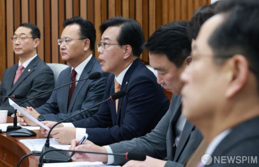 [서울=뉴스핌] 김학선 기자 = 송언석 국민의힘 원내대표가 9일 서울 여의도 국회에서 열린 원내대책회의를 주재하며 발언하고 있다. 2025.12.09 yooksa@newspim.com
