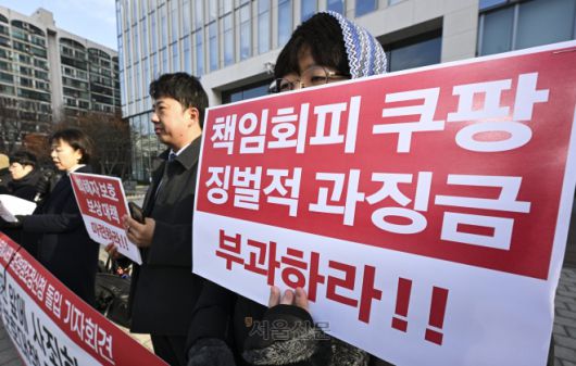 민변 민생경제위원회, 참여연대, 한국소비자연맹 관계자들이 3일 서울 송파구 쿠팡 본사 앞에서 ‘3370만 개인정보 유출 사태 집단분쟁조정신청 돌입 기자회견’을 열고 쿠팡의 사죄와 피해보상·보호대책 마련을 촉구하고 있다. 2025.12.3 이지훈 기자 |