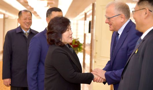 2024년 10월 28일 최선희 북한 외무상(가운데) 일행이 러시아를 공식 방문하기 전에 알렉산드르 마체고라 주북한 러시아대사와 악수하고 있다. 조선중앙통신·연합뉴스 |