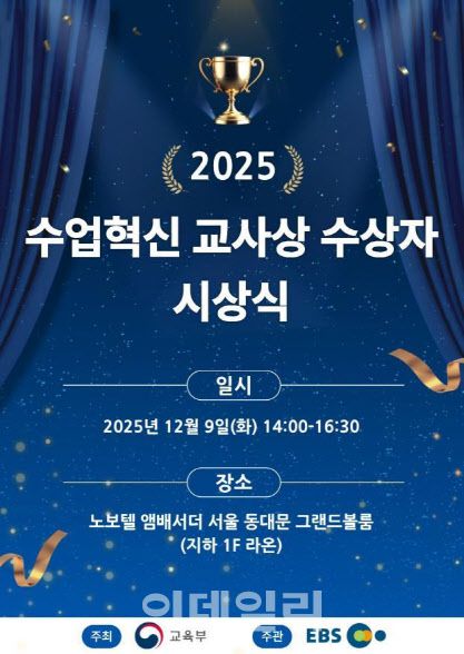 시상식은 이날 오후 2시 서울 동대문 노보텔 앰배서더에서 열린다. 수상자인 교사 100명을 대표해 김유리(대구 남동초)·김동호(경기 늘푸른중)·강대혁(전남 순천미래과학고) 교사가 수상 소감과 수업 사례를 공유할 예정이다.