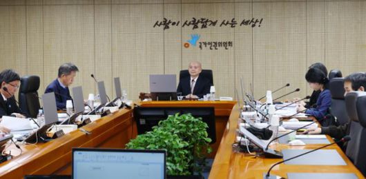 지난 1일 안창호 국가인권위원장과 인권위원들이 서울 중구 국가인권위원회에서 열린 제22차 전원위원회의에서 양평 공무원 사망 사건에 민중기 특별검사팀의 인권침해 여부를 담은 직권조사 결과 보고서를 의결할지 논의하고 있다. 뉴시스 |