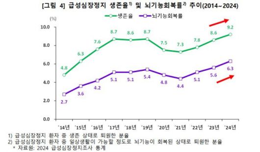 급성심장정지 환자 생존율은 9.2%, 뇌기능회복률은 6.3%로 조사 시작 이후 가장 높은 수준을 보였다. 전년도 대비 각각 0.6%포인트(2023년 8.6%), 0.7%포인트(2023년 5.6%) 증가했다.