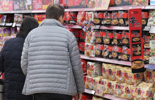 (서울=뉴스1) 김성진 기자 = 연말을 맞아 빵류와 가공식품을 중심으로 가격 상승세가 이어지면서 소비자 장바구니 부담이 커지고 있다. 9일 농림축산식품부에 따르면, 11월 국제 곡물 가격이 1.8% 상승하며 연말 가공식품 가격 부담을 높였다. 유엔 식량농업기구(FAO)가 발표한 11월 곡물 가격지수는 105.5포인트(p)로, 전월 103.6p에서 올랐다. 반면 세계식량지수는 같은 기간 1.2% 하락했다. 사진은 이날 서울 시내 한 대형마트에 라면이 진열돼 있다. 2025.12.9/뉴스1