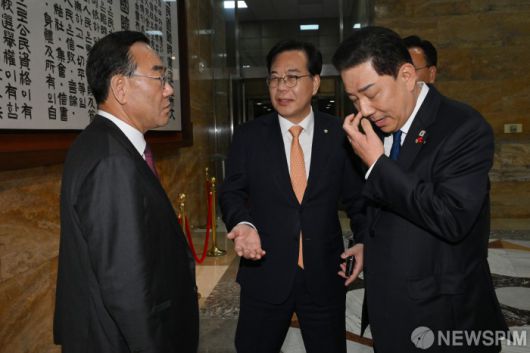 [서울=뉴스핌] 정일구 기자 = 김병기 더불어민주당 원내대표와 송언석 국민의힘 원내대표가 9일 서울 여의도 국회에서 우원식 국회의장 주재 회동을 마치고 주호영 국회부의장과 대화하고 있다. 2025.12.09 mironj19@newspim.com