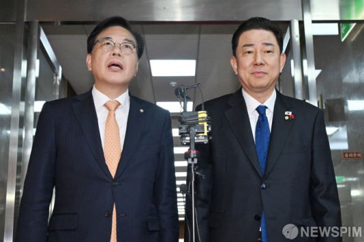 [서울=뉴스핌] 정일구 기자 = 김병기 더불어민주당 원내대표와 송언석 국민의힘 원내대표가 9일 서울 여의도 국회에서 우원식 국회의장 주재 회동을 마치고 취재진 질문에 답하고 있다. 2025.12.09 mironj19@newspim.com