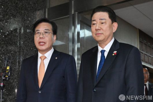 [서울=뉴스핌] 정일구 기자 = 김병기 더불어민주당 원내대표와 송언석 국민의힘 원내대표가 9일 서울 여의도 국회에서 우원식 국회의장 주재 회동을 마치고 취재진 질문에 답하고 있다. 2025.12.09 mironj19@newspim.com