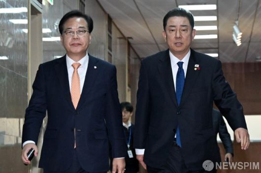 [서울=뉴스핌] 정일구 기자 = 김병기 더불어민주당 원내대표와 송언석 국민의힘 원내대표가 9일 서울 여의도 국회에서 우원식 국회의장 주재 회동을 마치고 이동하고 있다. 2025.12.09 mironj19@newspim.com