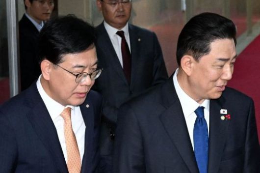 김병기(오른쪽) 더불어민주당 원내대표와 송언석 국민의힘 원내대표가 9일 국회에서 우원식 국회의장과 회동을 가진 뒤 의장실을 나서고 있다. <ⓒ투자가를 위한 경제콘텐츠 플랫폼, 아시아경제(www.asiae.co.kr) 무단전재 배포금지>