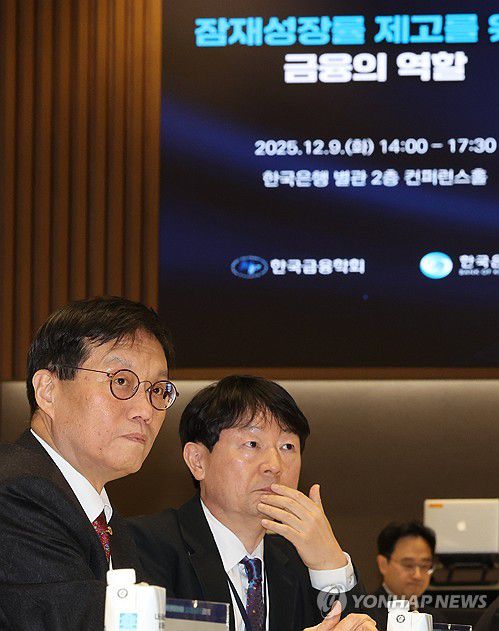 (서울=연합뉴스) 이진욱 기자 = 9일 서울 중구 한국은행에서 '잠재성장률 제고를 위한 금융의 역할'을 주제로 열린 한은·한국금융학회 공동 정책 심포지엄에서 이창용 한국은행 총재(왼쪽), 신관호 한국금융학회 회장이 참석해 있다. 2025.12.9