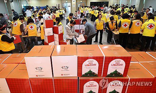 (인천=연합뉴스) 임순석 기자 = 9일 인천 연수구 대한적십자사 인천지사에서 열린 혹한기 취약계층 방한용품 지원을 위한 '2025 나눔션샤인' 행사에서 자원봉사자들이 장갑, 목도리, 담요 등 방한용품을 상자에 담고 있다.