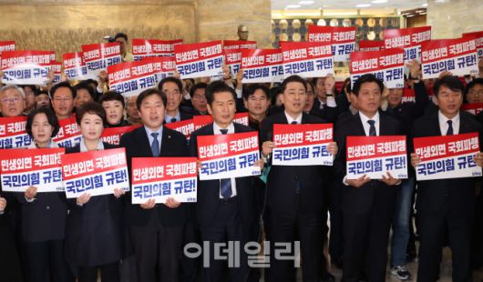 [이데일리 노진환 기자] 정청래 더불어민주당 대표와 김병기 원내대표 및 의원들이 9일 서울 여의도 국회 로텐더홀에서 ‘민생외면 국회파행, 국민의힘 규탄!’ 피켓을 들고 구호를 외치고 있다.