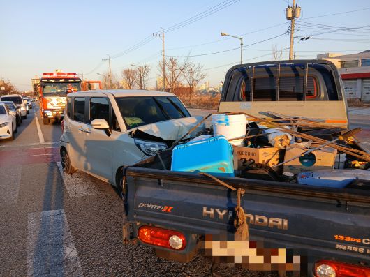 오늘(9일) 아침 7시 50분쯤 전북 전주 한 도로에서 소형차와 화물차가 부딪치는 사고가 발생했습니다.
