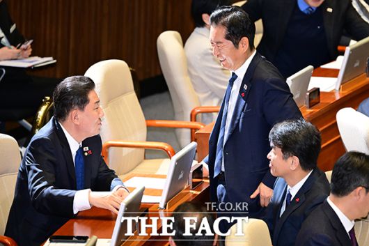 [더팩트ㅣ국회=남윤호 기자] 정청래 더불어민주당 대표(가운데)와 김병기 원내대표(왼쪽)가 9일 오후 서울 여의도 국회에서 열린 본회의에 참석해 대화를 나누고 있다. 오른쪽은 문진석 원내운영수석부대표.