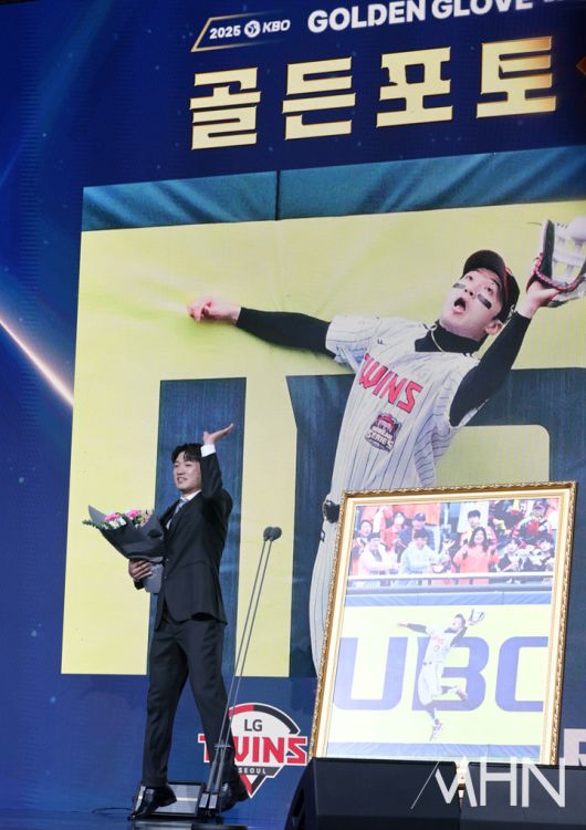 LG 트윈스 박해민이 골든포토상을 수상하며 사진과 같이 포즈를 취하고 있다.