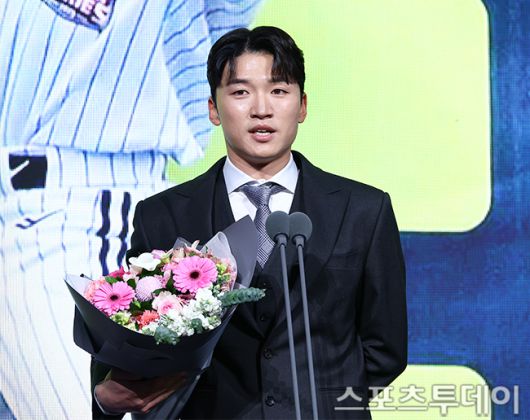 [스포츠투데이 팽현준 기자] 9일 서울 잠실 롯데호텔월드에서 열린 2025 KBO 골든글러브 시상식에서 골든포토상을 수상한 LG트윈스 박해민이 소감을 말하고 있다. 골든포토상 수상자에게는 트로피와 액자, 니콘이미징코리아에서 후원한 미러리스 카메라가 부상으로 전달된다. 2025.12.09. [스포츠투데이 팽현준 기자 sports@stoo.com]