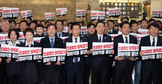한편 국민의힘이 필리버스터에 돌입하자 민주당 의원들은 본회의장 앞에서 ‘민생법안 발목잡기’·‘필버 악용 중단’ 등이 쓰인 손피켓을 들고 규탄 피켓시위를 진행했다.