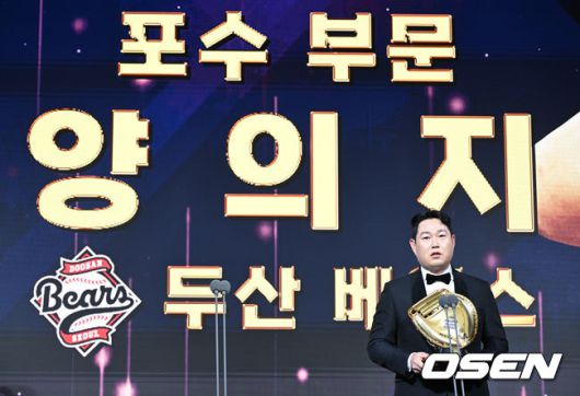 [OSEN=조은정 기자] 9일 오후 서울 송파구 잠실동 롯데호텔 월드에서 2025 신한은행 SOL 뱅크 KBO 골든글러브 시상식이 열렸다. KBO 골든글러브 시상식은 포지션별 최고의 선수를 가리는 자리로 올 시즌의 대미를 장식하는 자리다. 포수 부문 수상한 두산 양의지가 소감을 전하고 있다. 2025.12.09 /cej@osen.co.kr