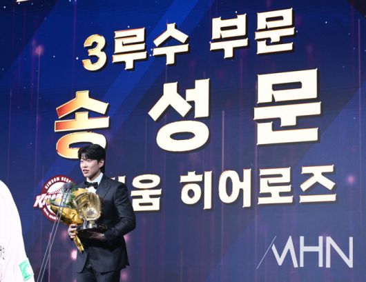 키움 히어로즈 송성문이 3루수 부문 골든글러브를 수상하고 소감을 말하고 있다.
