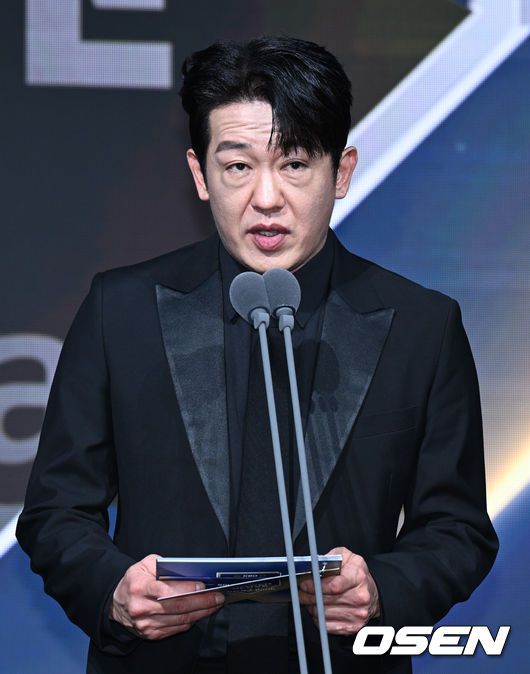 [OSEN=조은정 기자] 9일 오후 서울 송파구 잠실동 롯데호텔 월드에서 2025 신한은행 SOL 뱅크 KBO 골든글러브 시상식이 열렸다. KBO 골든글러브 시상식은 포지션별 최고의 선수를 가리는 자리로 올 시즌의 대미를 장식하는 자리다. 시상을 위해 참석한 배우 허성태가 인사말을 하고 있다. 2025.12.09 /cej@osen.co.kr