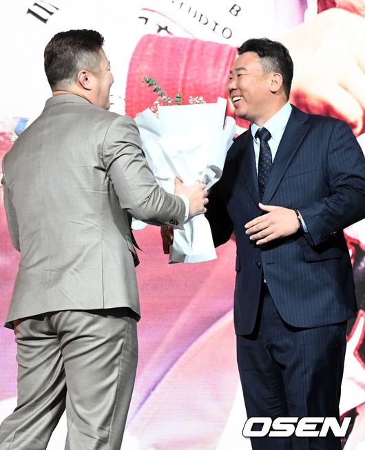 [OSEN=조은정 기자] 9일 오후 서울 송파구 잠실동 롯데호텔 월드에서 2025 신한은행 SOL 뱅크 KBO 골든글러브 시상식이 열렸다. KBO 골든글러브 시상식은 포지션별 최고의 선수를 가리는 자리로 올 시즌의 대미를 장식하는 자리다. 지명타자 부문 수상한 삼성 최형우가 KIA 이범호 감독에게 꽃다발을 받고 있다. 2025.12.09 /cej@osen.co.kr