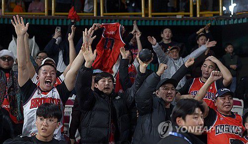 (창원=연합뉴스) 김동민 기자 = 9일 경남 창원체육관에서 열린 2025-2026 동아시아 슈퍼리그(EASL) 조별리그 C조 예선 창원 LG 세이커스와 몽골(XAC) 자크 브롱코스 경기 종료 후 XAC 팬이 XAC 선수단을 응원하고 있다. 이날 LG가 XAC에 98대 83으로 승리했다. 2025.12.9