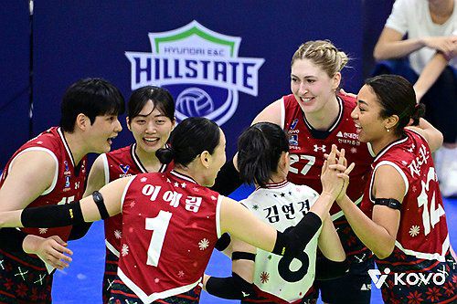 (서울=연합뉴스) 현대건설 선수들이 9일 수원체육관에서 열린 프로배구 여자부 페퍼저축은행과의 홈 경기에서 득점한 뒤 기뻐하고 있다. 2025.12.9 [한국배구연맹 제공. 재판매 및 DB금지]