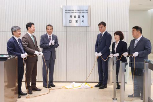 김건희 여사 관련 의혹들을 수사하는 민중기(왼쪽 세 번째) 특별검사를 비롯한 특별검사보들이 7월 2일 서울 종로구 KT광화문빌딩WEST에 마련된 특검 사무실에서 현판 제막을 하고 있다. 왼쪽부터 문홍주·박상진 특검보, 민중기 특검, 김형근·오정희 특검보, 홍지항 지원단장. 정다빈 기자 |