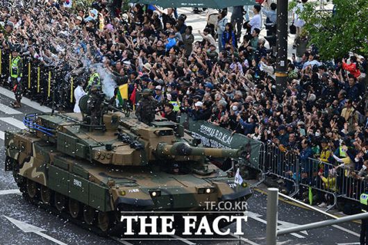 대통령실은 9일(현지시간) 오후 한국 방산기업이 페루에 K2전차와 장갑차를 공급하는 총괄합의서(Framework Agreement)가 체결됐다고 밝혔다. 2024년 10월 1일 서울 중구 세종대로에서 국군 K2 전차가 행진하고 있다. |