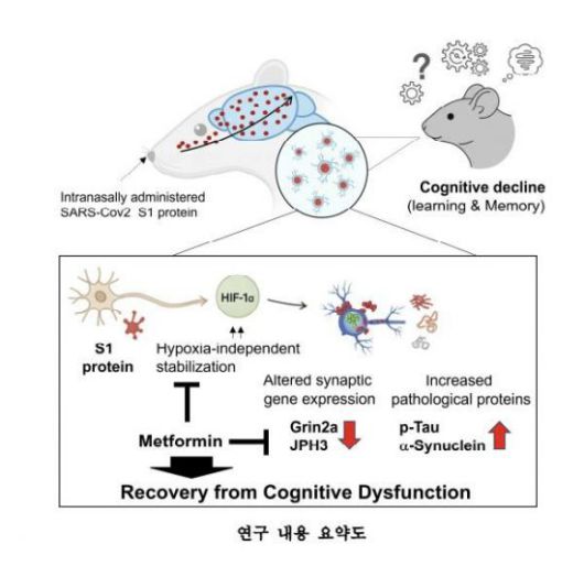실험에서 쥐에게 S1 단백질을 비강으로 투여한 결과, 학습·기억 능력이 감소하고 불안 행동이 증가해 코로나19 감염 후 나타나는 인지 저하와 유사한 양상이 관찰되었다. 또한 투여 6주 후 뇌(해마)에서는 신경세포 수 감소와 함께 퇴행성 뇌 질환에서 나타나는 병리 단백질 축적이 확인되어 장기적인 뇌 손상 가능성이 제기되었다.