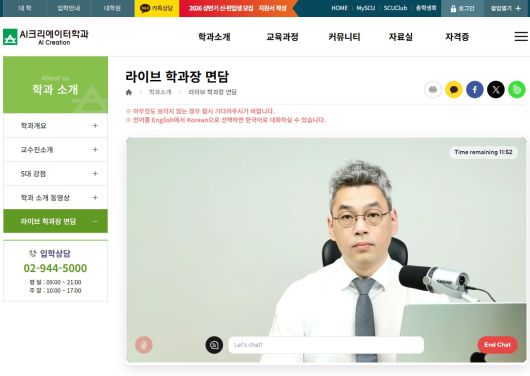 놀라운 싱크로율을 자랑하는 김환 학과장의 AI 버추얼 라이브 면담은 서울사이버대학교 AI크리에이터학과 홈페이지에서 누구나 체험해 볼 수 있다.