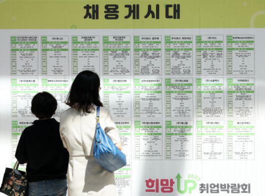 [서울=뉴스핌] 정일구 기자 = 지난 9월 11일 오후 서울 영등포구 FKI타워 컨퍼런스센터에서 열린 '2025 희망 업(UP) 취업박람회'에서 구직자들이 채용게시대를 살펴보고 있다. 한국경제인협회 중소기업협력센터와 영등포구청이 공동 개최한 이번 행사는 중장년 고용 확대와 경력 단절 해소, 지역 일자리 창출을 목표로 마련됐다. 2025.09.11 mironj19@newspim.com |