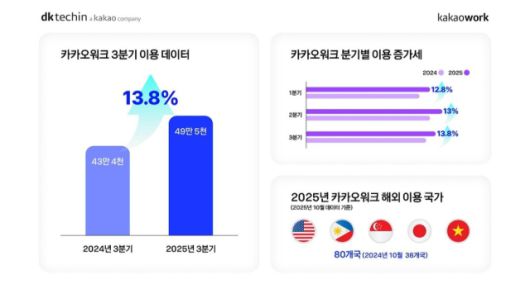 카카오워크 올해 3분기(2025년 7~9월) 기준 누적 이용자 수는 49만5000명으로 전년 대비 13.8% 증가했다. 1분기부터 이미 지난해 전체 수치를 넘어서는 흐름을 보였으며 4분기 들어 10·11월 이용량이 지난해 같은 기간을 앞서면서 역대 최고 성과가 예상된다.