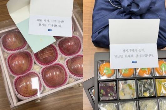 조국혁신당이 조국 대표의 취임 예방 감사 답례품을 각 정당에 선물한 가운데, 국민의힘 측에만 떡이 아닌 사과를 전달했다. 조국혁신당 |