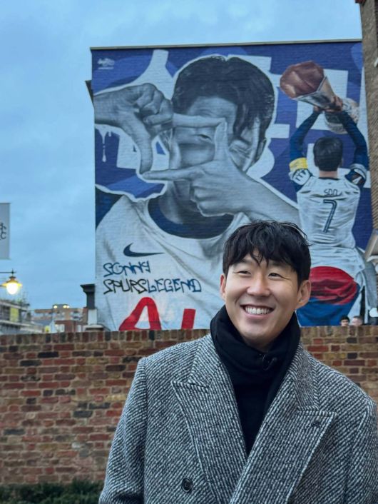 경기장 방문에 앞서 손흥민은 스타디움 주변 건물 외벽에 그려진 자신의 대형 벽화를 직접 찾았다. 벽화에는 손흥민의 트레이드마크인 ‘찰칵 세리머니’, 허리에 두른 태극기, 그리고 유로파리그 우승 트로피가 정교하게 묘사돼 있다.