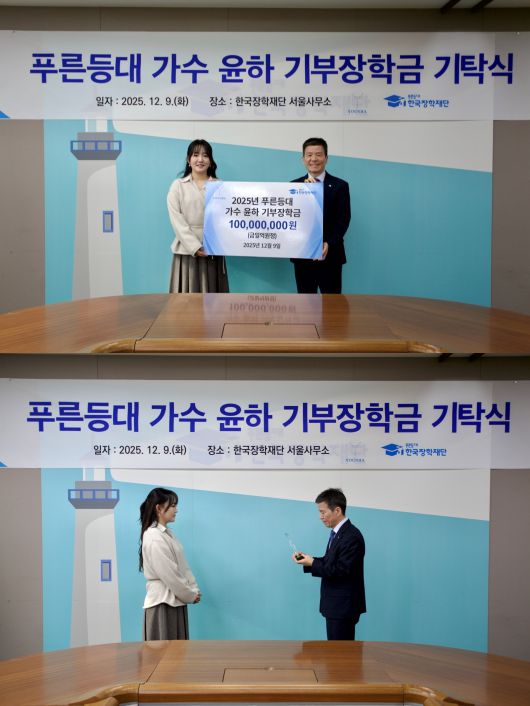 윤하는 지난 9일 서울 중구 한국장학재단 서울사무소에서 개최된 '2025년 푸른등대 가수 윤하 기부장학금' 기탁식에 참석했다.