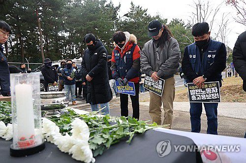(태안=연합뉴스) 이주형 기자 = 2018년 충남 태안화력발전소에서 끼임 사고로 숨진 청년 비정규직 노동자 고(故) 김용균 씨 7주기 현장 추모제가 10일 태안화력 앞에서 진행되고 있다. 추모제는 고인의 어머니인 김미숙 김용균재단 이사장과 동료 노동자 등 100여명이 참석한 가운데 연대 발언과 문화공연 등으로 꾸며졌다. 2025.12.10