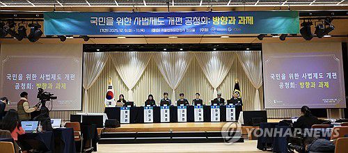 (서울=연합뉴스) 최재구 기자 = 10일 서초구 서울법원종합청사에서 국민을 위한 사법제도 개편 공청회 4세션이 열리고 있다. 2025.12.10 jjaeck9@yna.co.kr ▶제보는 카카오톡 okjebo▶연합뉴스 앱 지금 바로 다운받기~▶네이버 연합뉴스 채널 구독하기 <저작권자(c) 연합뉴스, 무단 전재-재배포, AI 학습 및 활용 금지><저작권자(c)연합뉴스. 무단전재-재배포금지.>