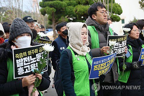 (태안=연합뉴스) 이주형 기자 = 2018년 충남 태안화력발전소에서 끼임 사고로 숨진 청년 비정규직 노동자 고(故) 김용균 씨 7주기 현장 추모제가 10일 태안화력 앞에서 진행되고 있다. 추모제는 고인의 어머니인 김미숙 김용균재단 이사장과 동료 노동자 등 100여명이 참석한 가운데 연대 발언과 문화공연 등으로 꾸며졌다. 2025.12.10