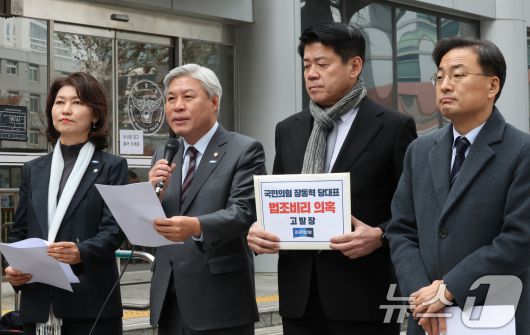 (서울=뉴스1) 장수영 기자 = 서왕진 조국혁신당 원내대표(왼쪽 두번째)가 10일 오전 서울 서대문구 경찰청에서 장동혁 국민의힘 대표의 법조비리 의혹과 관련한 고발장 접수 기자회견을 하고 있다. 왼쪽부터 강경숙 의원, 서왕진 원내대표, 김준형 의원, 신장식 의원. 2025.12.10/뉴스1