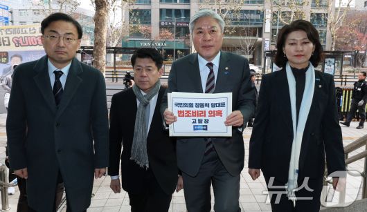 (서울=뉴스1) 장수영 기자 = 서왕진 조국혁신당 원내대표(왼쪽 세번째)가 10일 오전 서울 서대문구 경찰청에서 장동혁 국민의힘 대표의 법조비리 의혹과 관련한 고발장을 들어 보이며 민원실로 이동하고 있다. 왼쪽부터 신장식 의원, 김준형 의원, 서왕진 원내대표, 강경숙 의원. 2025.12.10/뉴스1