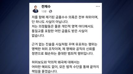 통일교로부터 금품을 수수했다는 민주당 인사가 전재수 해양수산부 장관이라는 의혹이 제기된 가운데, 전 장관은 관련 의혹은 모두 허위라고 반박했습니다.
