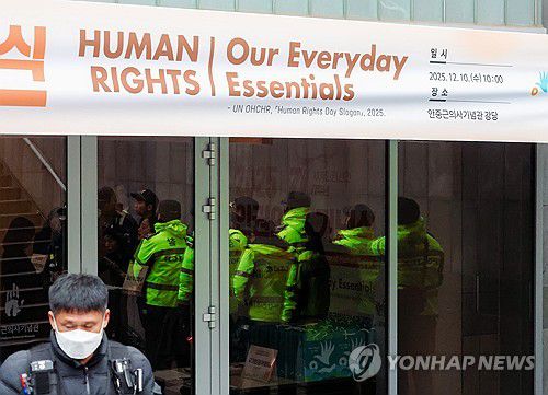 (서울=연합뉴스) 서대연 기자 = 국가인권위원회 바로잡기 공동행동이 서울 중구 안중근 의사 기념관에서 열리는 인권의날 기념행사에 안창호 위원장의 출입저지 행동을 예고한 10일 경찰들이 기념관 주변 경비를 서고 있다. 2025.12.10 [공동취재]