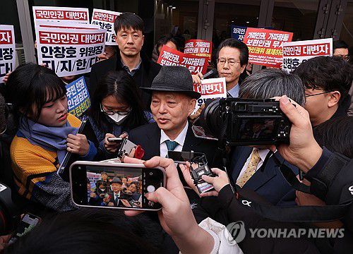 (서울=연합뉴스) 서대연 기자 = 안창호 국가인권위원장이 10일 서울 중구 안중근의사기념관에서 열린 세계인권선언 77주년 2025 인권의 날 기념식에 참석하려다 인권단체 회원들에게 저지당해 발길을 돌린 뒤 입장 표명을 하고 있다. 2025.12.10 [공동취재]