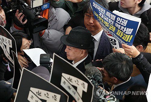 (서울=연합뉴스) 서대연 기자 = 안창호 국가인권위원장이 10일 서울 중구 안중근의사기념관에서 열린 세계인권선언 77주년 2025 인권의 날 기념식에 참석하려다 인권단체 회원들에게 저지당하고 있다. 2025.12.10 [공동취재]