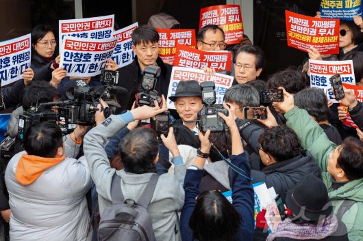 (서울=뉴스1) 김진환 기자 = 10일 서울 중구 안중근 의사 기념관에서 열린 인권의날 기념행사에 참석하던 안창호 국가인권위원회 위원장이 국가인권위원회 바로잡기 공동행동에 가로막히자 돌아 나가고 있다. (공동취재) 2025.12.10/뉴스1urodoct2@news1.krCopyright ⓒ 뉴스1. All rights reserved. 무단 전재 및 재배포, AI학습 이용 금지.