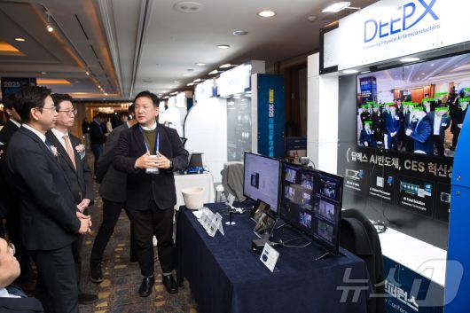 (서울=뉴스1) = 배경훈 부총리 겸 과학기술정보통신부 장관이 10일 오전 서울 중구 롯데호텔에서 열린 '2025 인공지능반도체 미래기술 컨퍼런스' 에 참석해 딥엑스 관계자로부터 설명을 듣고 있다. (과학기술정보통신부 제공. 재판매 및 DB 금지) 2025.12.10/뉴스1